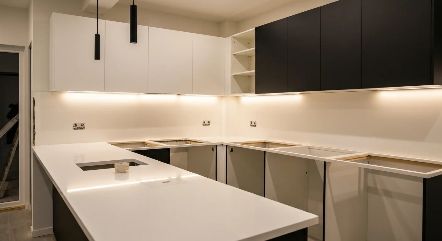 - ●Master craftsmen doing the detail work. The trim, the tile lines, the cabinet alignment — the details that separate a good kitchen from a great one.